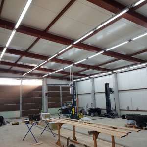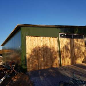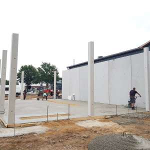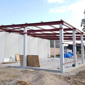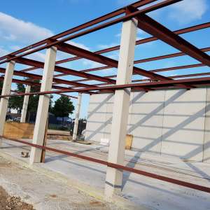 Anbau einer Lagerhalle an ein bestehendes Gebäude. Dieses Bauwerk wird in Stahl- und Stahlbetonbauweise gebaut. Baubeginn: Juli 2019 Fertigstellung: Oktober 2019